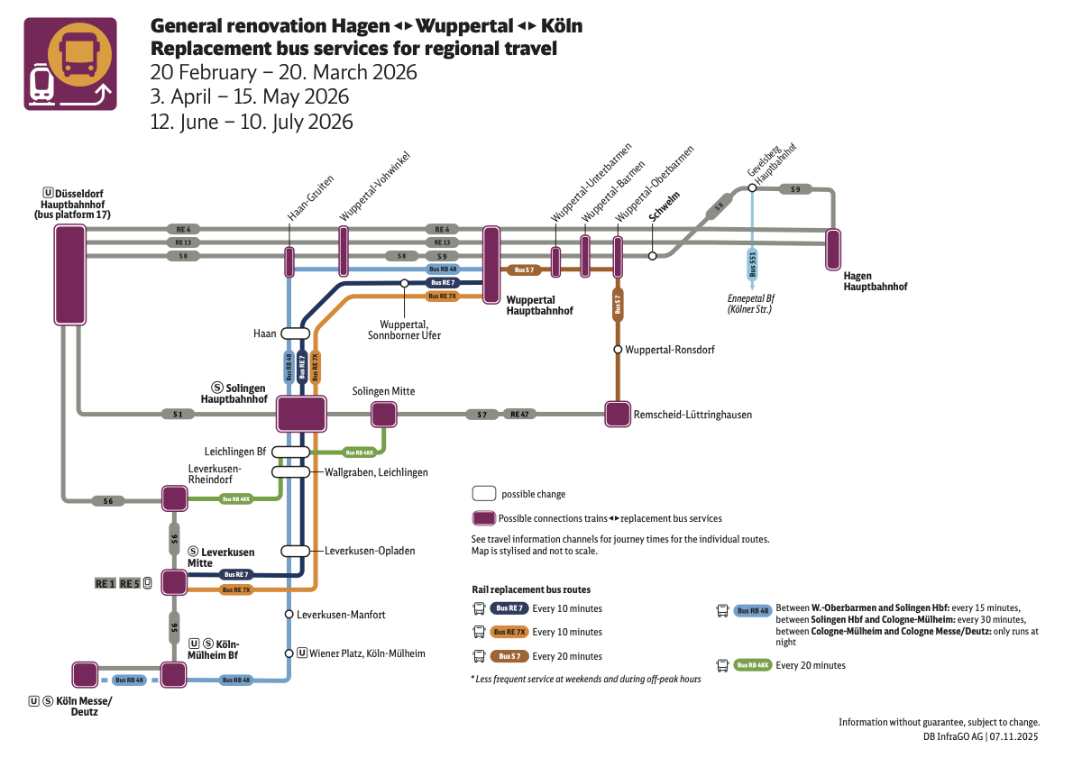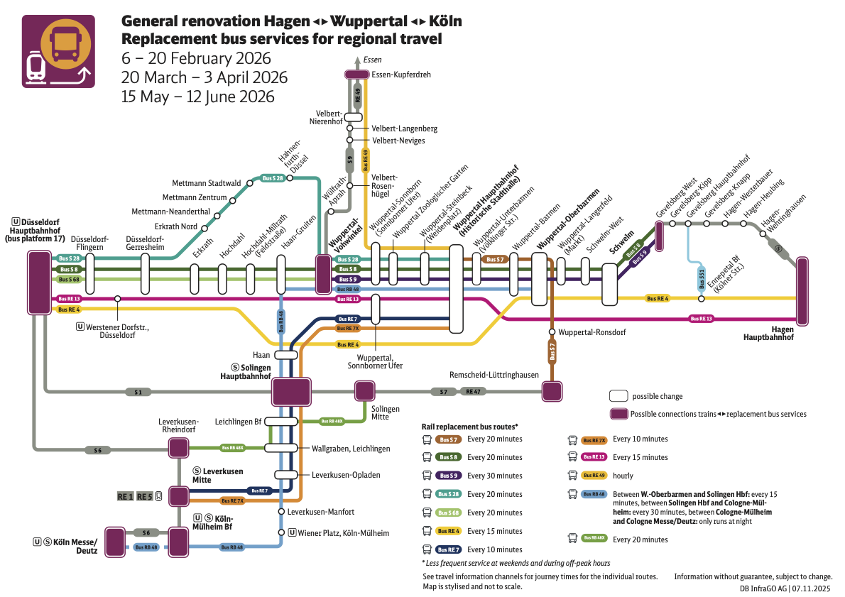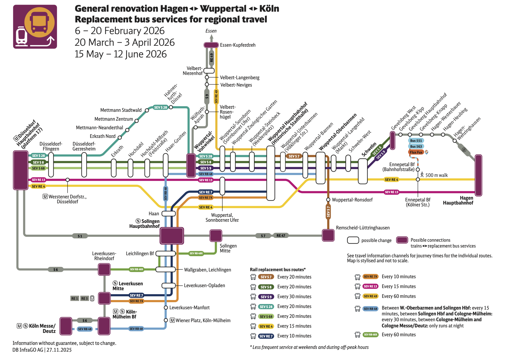 As part of the general renovation of the Hagen – Wuppertal – Cologne line, most regional train services will be suspended from 6 February 2026 to 10 July 2026. S-Bahn and RE trains between Hagen, Wuppertal and Düsseldorf will continue to run during much of the general renovation; however, shorter periods of service restrictions will apply.