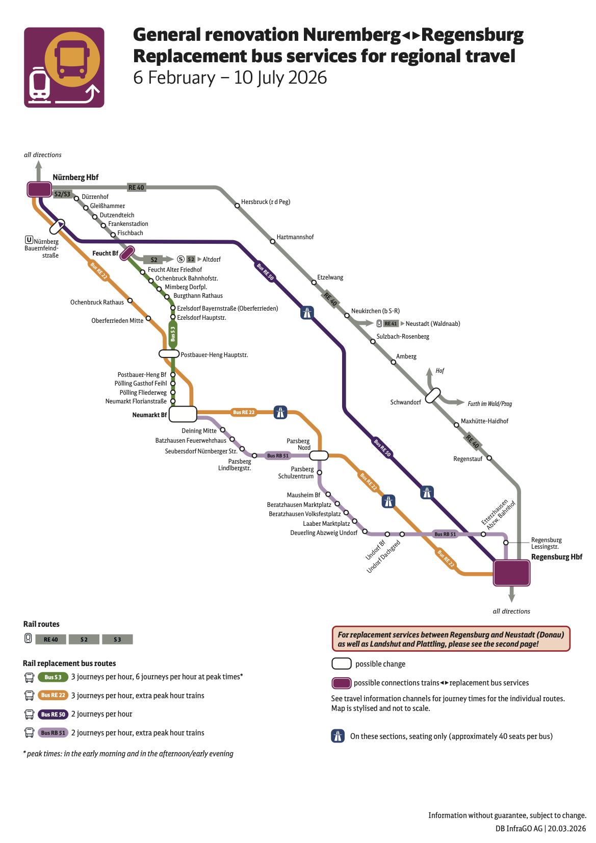 RE 50 | Nuremberg – Neumarkt (Oberpf.) – Regensburg – Straubing – Plattling | RE 50 will not run between Nuremberg and Regensburg. There will be a replacement bus service: Nuremberg – Regensburg