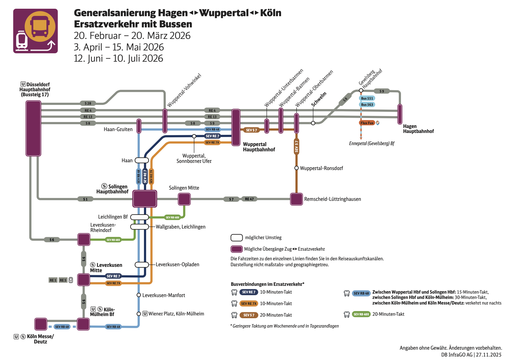 Im Zuge der Generalsanierung der Strecke Hagen – Wuppertal – Köln wird der regionale Zugverkehr vom 6. Februar 2026 bis 10. Juli 2026 größtenteils eingestellt. Der S-Bahn- und RE-Verkehr zwischen Hagen, Wuppertal und Düsseldorf soll über längere Zeiträume aufrechterhalten werden.