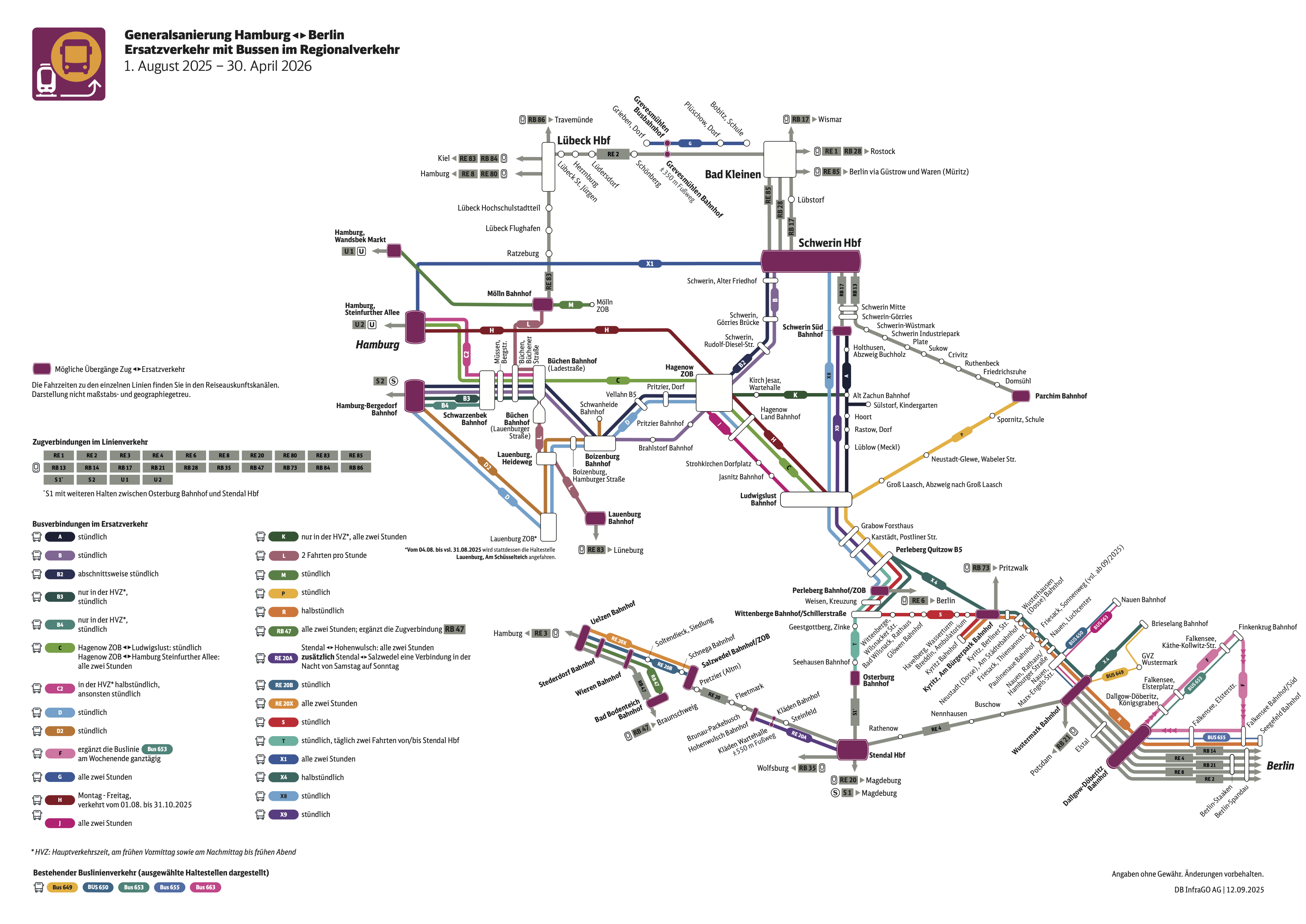 Im Zuge der Generalsanierung der Strecke Hamburg–Berlin wird der Zugverkehr vom 1. August 2025 bis 30. April 2026 stark eingeschränkt. Oftmals kann der Zugverkehr auf einzelnen Teilabschnitten einer Linie verkehren oder umgeleitet werden, grundsätzlich werden folgende Nahverkehrslinien jedoch (in Teilabschnitten) von Einschränkungen und Ersatzverkehren betroffen sein: